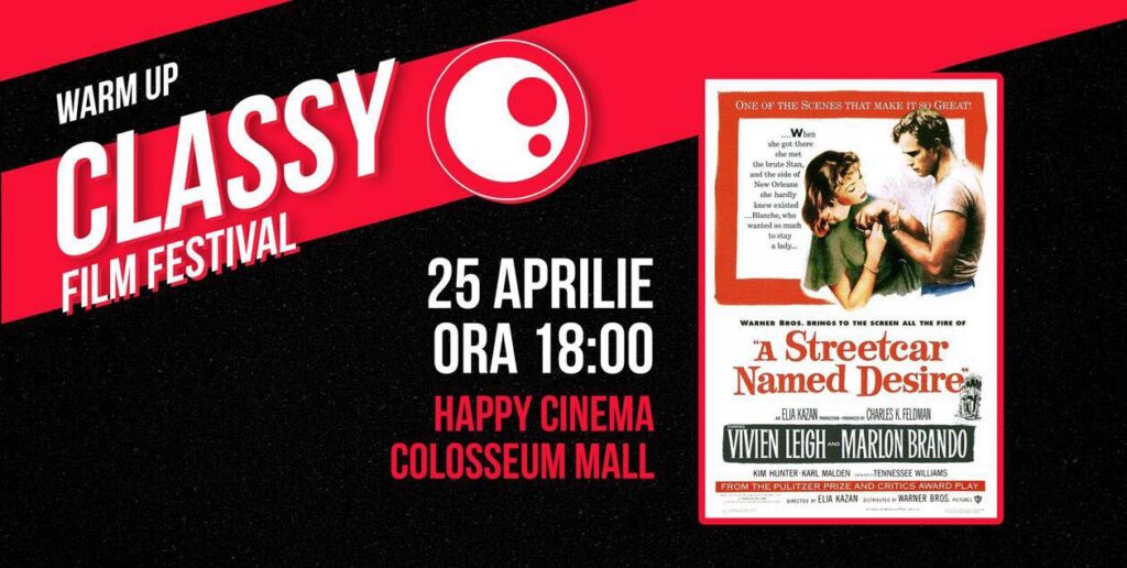 Înainte de startul oficial al festivalului, cinefilii sunt invitați la un eveniment special – Warm Up Classy Film Festival. Sâmbătă, 25 aprilie, de la ora 18:00, la Happy Cinema Colosseum, va avea loc proiecția filmului A Streetcar Named Desire (Un tramvai numit dorință), în regia lui Elia Kazan.