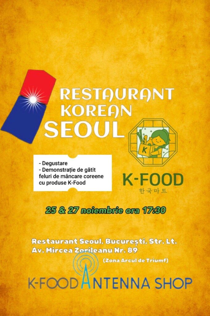 Participanții vor avea șansa să urmărească tehnici autentice de gătit și să guste preparate de un bucătar de la restaurantul Seoul, realizate pe loc, folosind ingrediente specifice bucătăriei coreene, de la magazinele K-Food România.