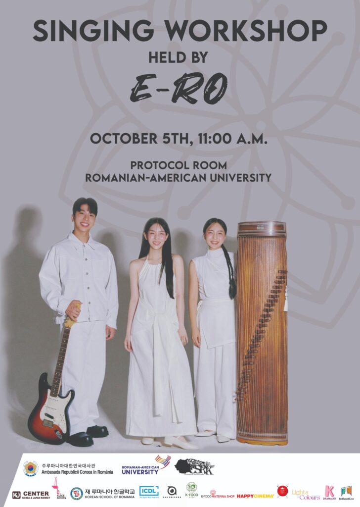 Spre bucuria publicului, E-ro va susține și un Atelier de Voce duminică, 5 octombrie, la ora 11:00, în Sala de Protocol a Universității Româno-Americane, oferind o incursiune practică în tehnicile muzicale coreene.