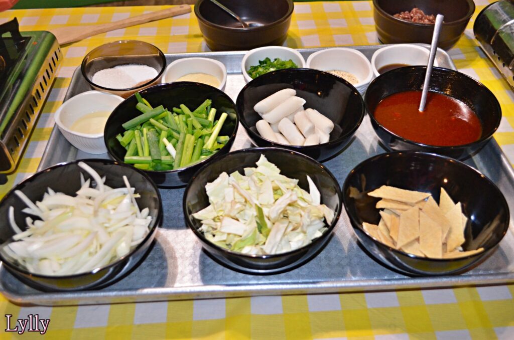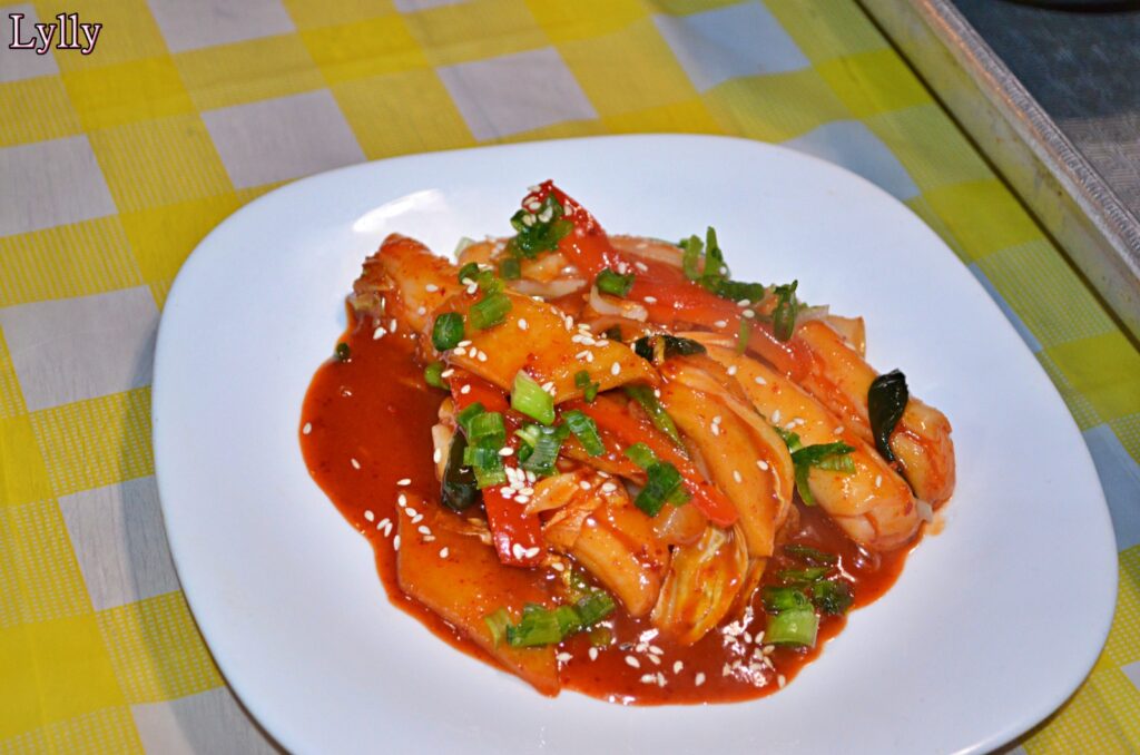 • Tteokbokki, considerat simbolul street food-ului coreean, gătit într-un sos dulce-picant pe bază de gochujang.